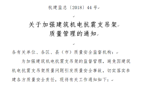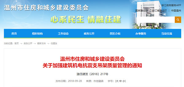 三、浙江温州抗震支架,温住建发(2018)217号文件《关于加强建筑机电抗震支吊架质量管理的通知》
