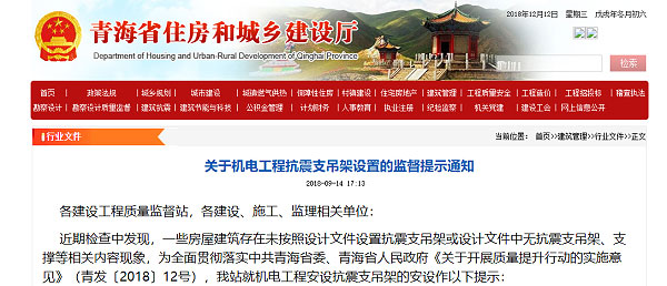 四、青海省抗震支架,青海省住房和城乡建设厅发文《关于机电工程抗震支吊架设置的监督提示通知》